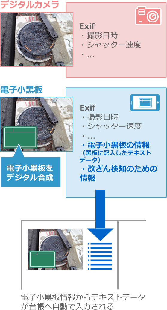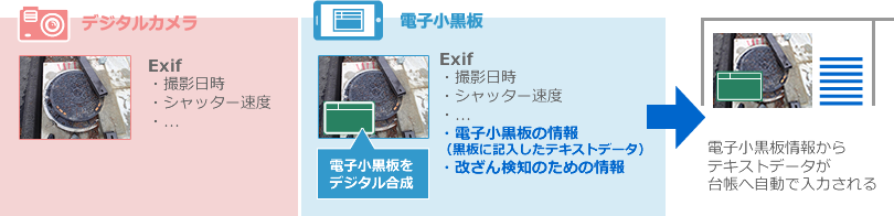 電子小黒板はExif情報だけではなく、電子小黒板の情報も書き込まれています。台帳の仕分け情報や台帳に書き込む文書も含まれるため、写真の仕分けや文書の入力は自動で行われます。