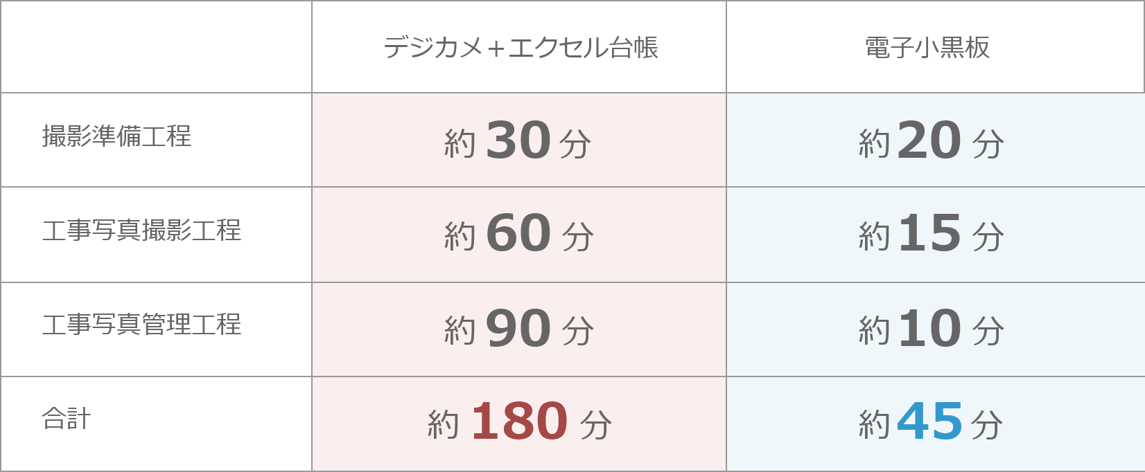 電子小黒板を利用することで、それぞれの工程の作業時間は格段に短くなりました。特に工事写真管理については1/9に短縮。トータルで、人的コストを1/4まで削減することに成功しました。(※1)