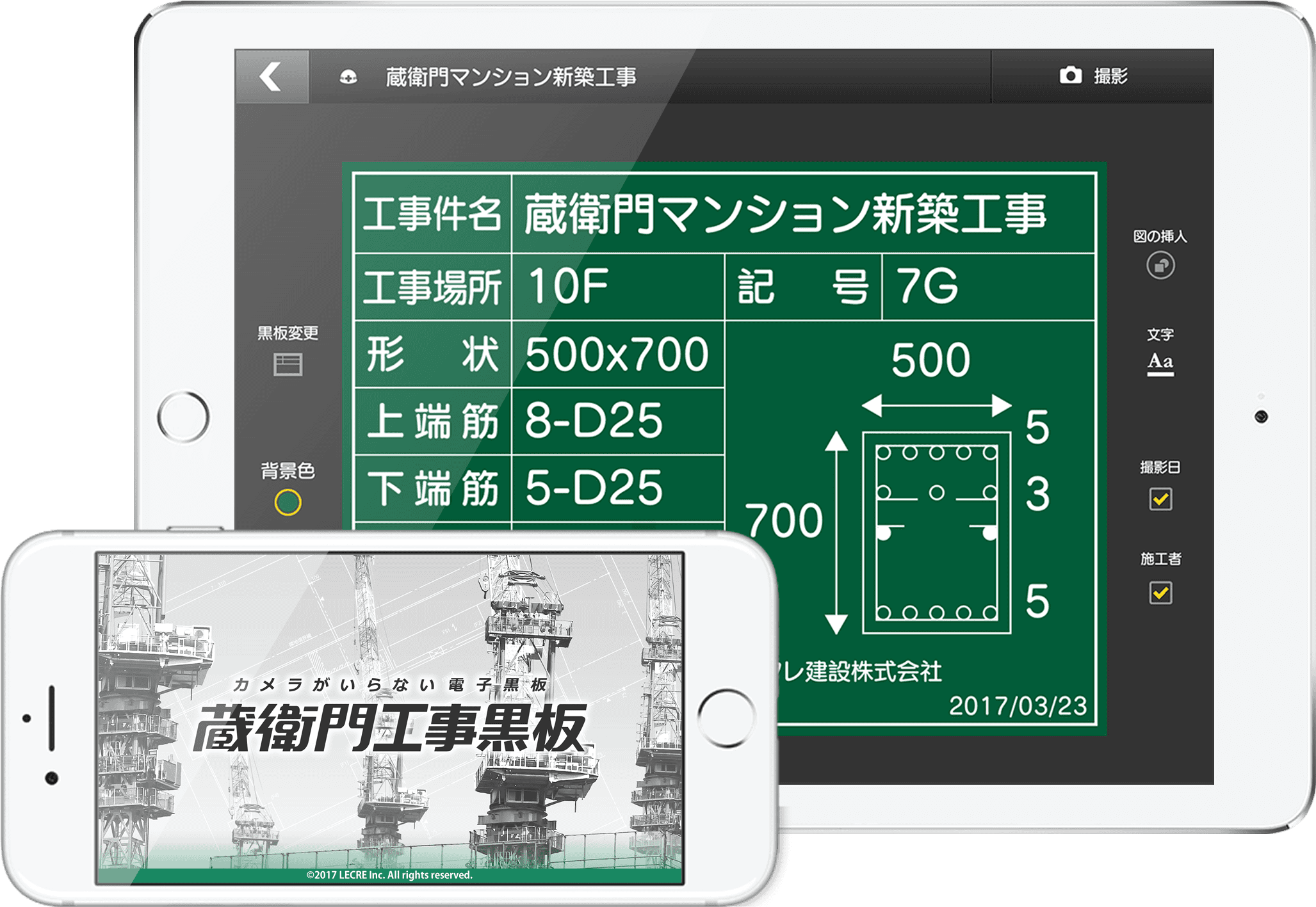 ■蔵衛門電子小黒板シリーズ ルクレは工事黒板とデジカメが一体になった防水・防塵の電子小黒板専用タブレット「蔵衛門Pad」と、手持ちのiPhoneやiPadで使用できるiOSアプリ「蔵衛門工事黒板」を展開しています。1,500種類以上の黒板テンプレートを搭載し、様々な現場・業種のフォーマットに対応しています。今年2月には、「蔵衛門Pad」の最新モデル3機種を発売。前モデルの2倍の記録メモリ領域をもち、最大100,000枚まで工事写真の保存が可能に。写真のデータ転送時間も2倍速くなりました。2サイズから選べ、さらに化学強化ガラス搭載の限定モデルも登場。中小建設企業から大手ゼネコンまで、日本全国の現場に導入されています。
