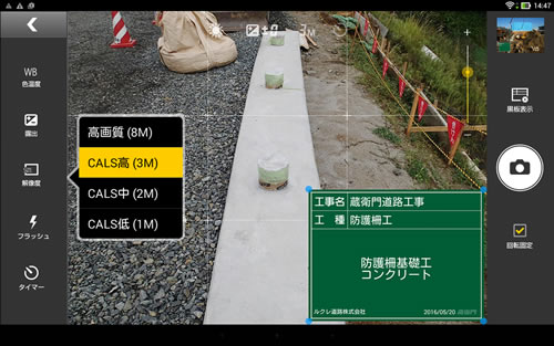 平成28年3月に国土交通省から発表された新しい「デジタル写真管理情報基準」では、デジタル写真の有効画素数が改定されました。黒板の文字及び撮影対象が確認できることを指標とし、今までは100万画素程度とされていましたが、100万~300万画素程度(1,200×900程度~2,000×1,500程度)として設定されました。蔵衛門Padでは、CALSモードに「CALS(3M)」モードを追加し、新しい「デジタル写真管理情報基準」に準拠した写真の撮影が可能です。