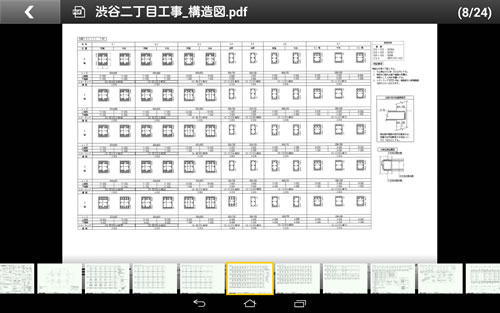 図面の倍率が5倍から50倍になりました。より細かく図面を閲覧することができます。さらにメニューが自動で隠れるようになったので、画面いっぱいに図面を表示させることが可能です。また、画面下部にサムネイルビューが表示されるので、ページ数が多い場合でも、目的のページにすぐにアクセスできます。