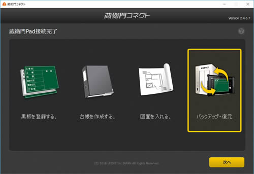 対応しました 蔵衛門Padのデータを蔵衛門ドライブにフルバックアップ/復元できる機能を追加しました。蔵衛門コネクト(Ver2.5.0.0以降)とパソコンを接続・もしくは蔵衛門PadをWi-Fiに接続することで、蔵衛門Padに入っている黒板・写真・豆図・図面などのデータを蔵衛門ドライブに直接バックアップ/復元することができます。複数台の蔵衛門Padを導入している現場で、黒板のデータを共有したいときに便利です。