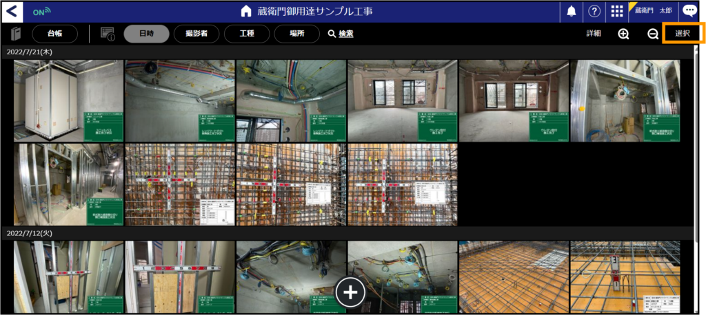 2.工事一覧より「写真」をクリックして、画面右上の「選択」を選びます