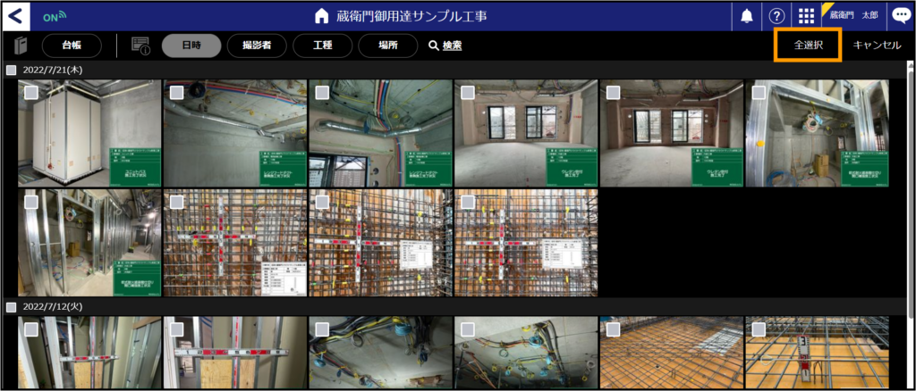 2.工事一覧より「写真」をクリックして、画面右上の「選択」を選びます