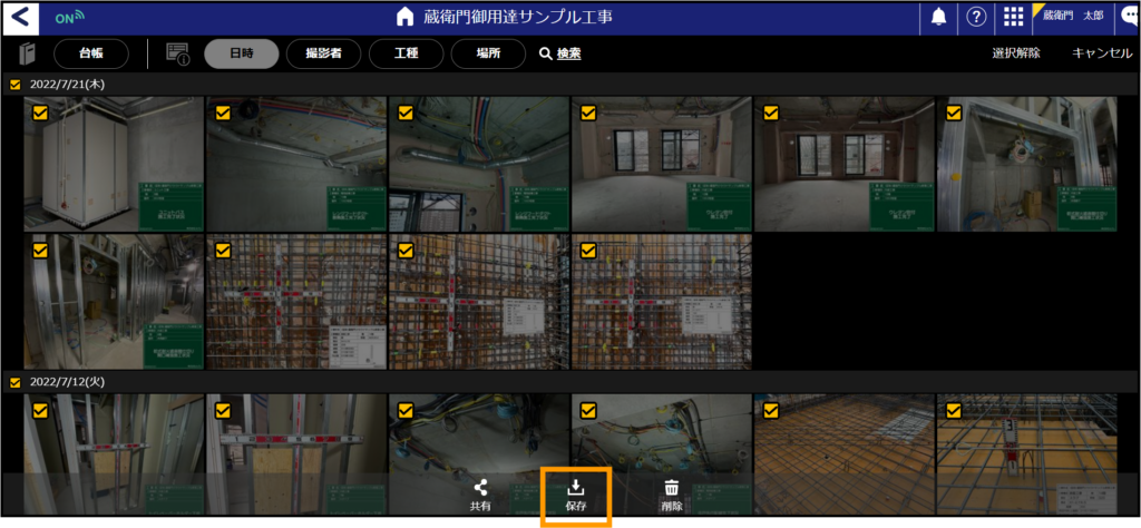 『蔵衛門プレミアム』の場合、写真を選択して「一括保存」することができます。