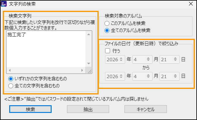 3.検索する文字や対象となるアルバムの選択、日付の絞り込みが行えます。