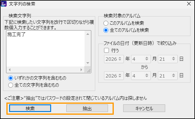 ※【抽出】を押すと、検索結果が別アルバムに出力されます。